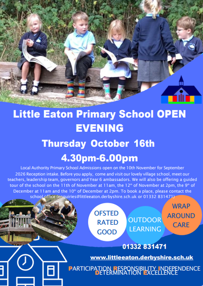 - We will also be offering a guided tour of the school on the 11th of November at 11am, the 12th of November at 2pm, the 9th of December at 11am and the 10th of December at 2pm. If you cannot attend these dates, please contact the school office to arrange an individual tour at enquiries@littleeaton.derbyshire.sch.uk or call 01332 831471.
